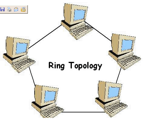 This topology is very similar to bus except the end of the network returns to the first node which means it is in a loop. In a ring network, each node takes a turn sending and receiving information through the use of a token. Only the node with the token is allowed to send data. All other nodes must wait until the token is not accompanyed by a message before they may use it to transmit. Ring topology has many of the same limitation of the bus topology.
