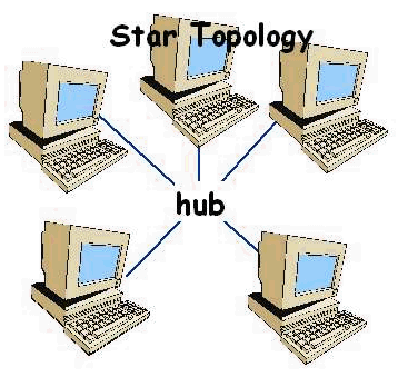 In a Star topology, all devices are connected to a central hub. The hub moves signals from any node and passes it along to all the other nodes in the network. Hubs do not filter or route data. They simply join nodes together. Star is the most common today since enables the network to remain stable, even when one cabling connection fails. If the hub fails however, the network will lose connection.